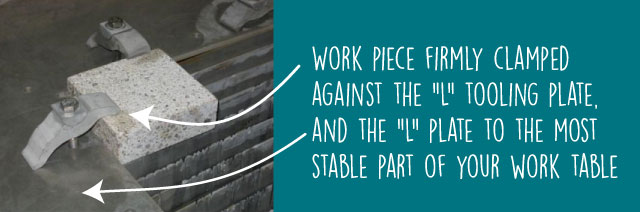Our customers quickly figure out what it takes to hold down a part, but often make the mistake of clamping the part to something that is wobbly. So, we not only want the part not to be pushed around the table, we want it to remain completely still. And lastly, we need to make sure no part of the cutting head will hit any of the clamps – because that will certainly cause downtime and possibly shop floor profanity.